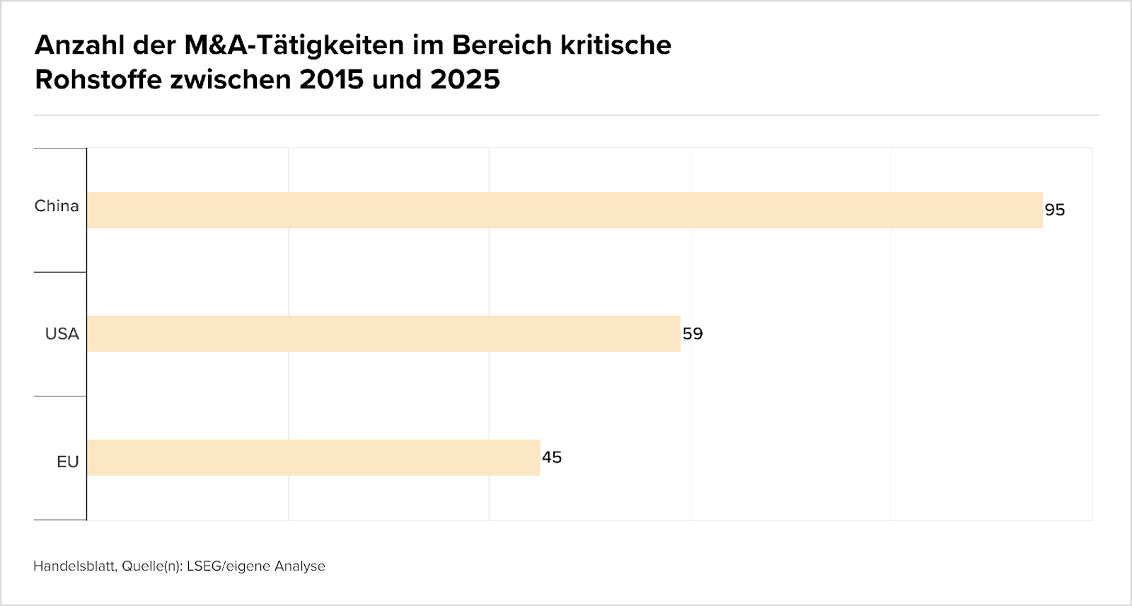 Chinesische Unternehmen haben sich in den letzten zehn Jahren einen beachtlichen Vorsprung bei der Übernahme von Minen und Raffinerien gesichert. Wie die untenstehende Grafik aus einer exklusiven Handelsblatt-Analyse zeigt, führten sie zwischen 2015 und 2025 weltweit 95 M&A-Transaktionen im Bereich kritischer Rohstoffe durch – deutlich mehr als Unternehmen aus den USA (59) oder der EU (45).