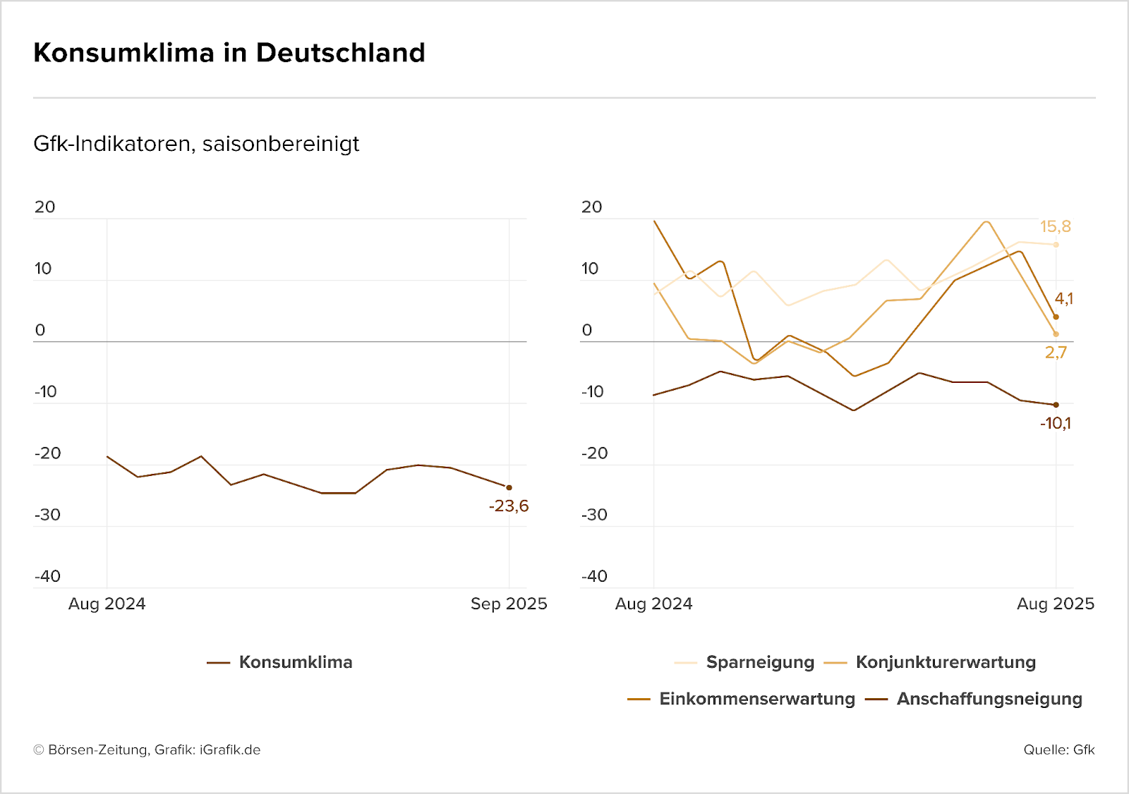 Wie die Grafik der Börsen-Zeitung zeigt, ist die Anschaffungsneigung auf –10,1 Punkte gefallen – ein deutlicher Rückgang gegenüber den Vormonaten. Gleichzeitig steigt die Sparneigung auf 15,8 Punkte. Auch die Einkommenserwartung verliert deutlich an Wert und fällt mit 4,1 Punkten auf den niedrigsten Stand seit März. Diese Entwicklung verstärkt die Zurückhaltung der Haushalte bei größeren Ausgaben.
