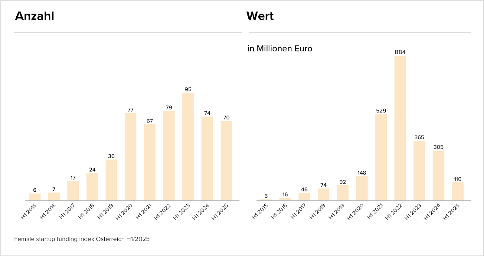 Im ersten Halbjahr 2025 erhielten nur elf der insgesamt 153 Gründer:innen, deren Start-ups eine Finanzierung abschließen konnten, weibliche Beteiligung. Dies entspricht lediglich 7,2 % und markiert einen deutlichen Rückgang gegenüber dem Vorjahr (11 %). 83 % der finanzierten Start-ups wurden von rein männlichen Teams gegründet, nur ein einziges Team war rein weiblich.
