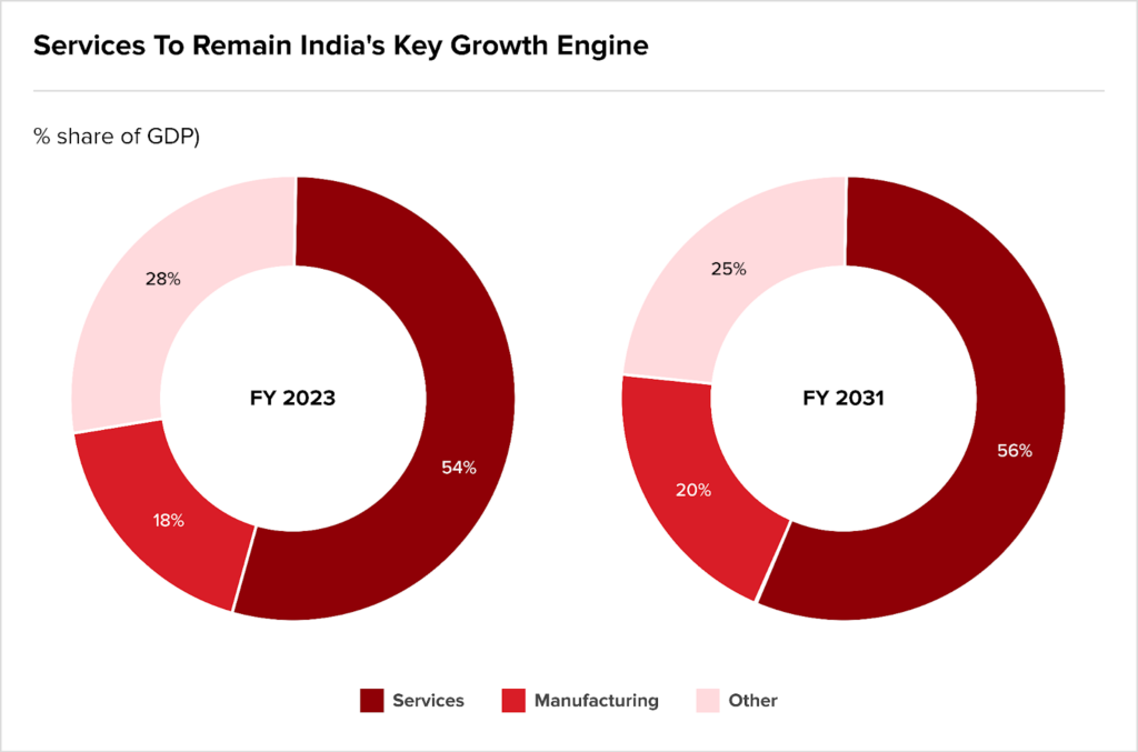 Back in 2023 (see chart below), CRISIL /S&P Global projected services to remain India’s growth engine into 2031 – but we all know a lot changed post-Trump, and matters remain mercurial.