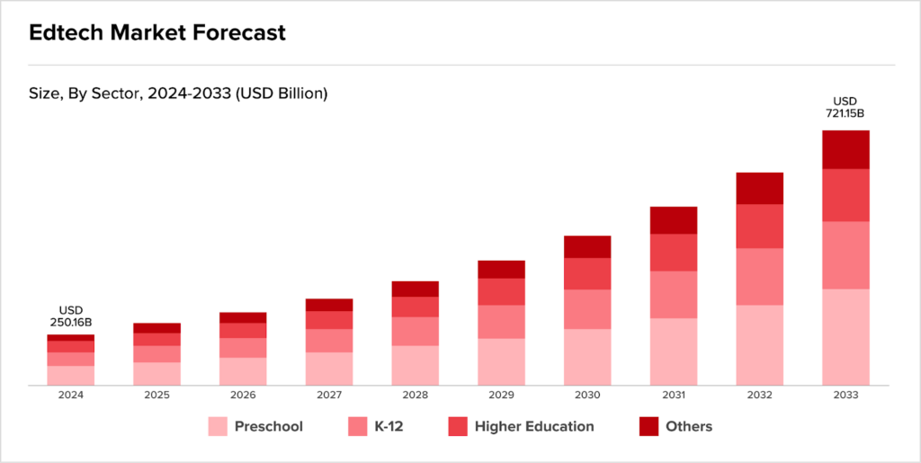 Globally, the market remains on a long-term growth curve. According to optimists, it might expand from $250.16 billion in 2024 to $721.15 billion by 2033, nearly triple its size as adoption deepens across preschool, K–12, higher education, and upskilling.