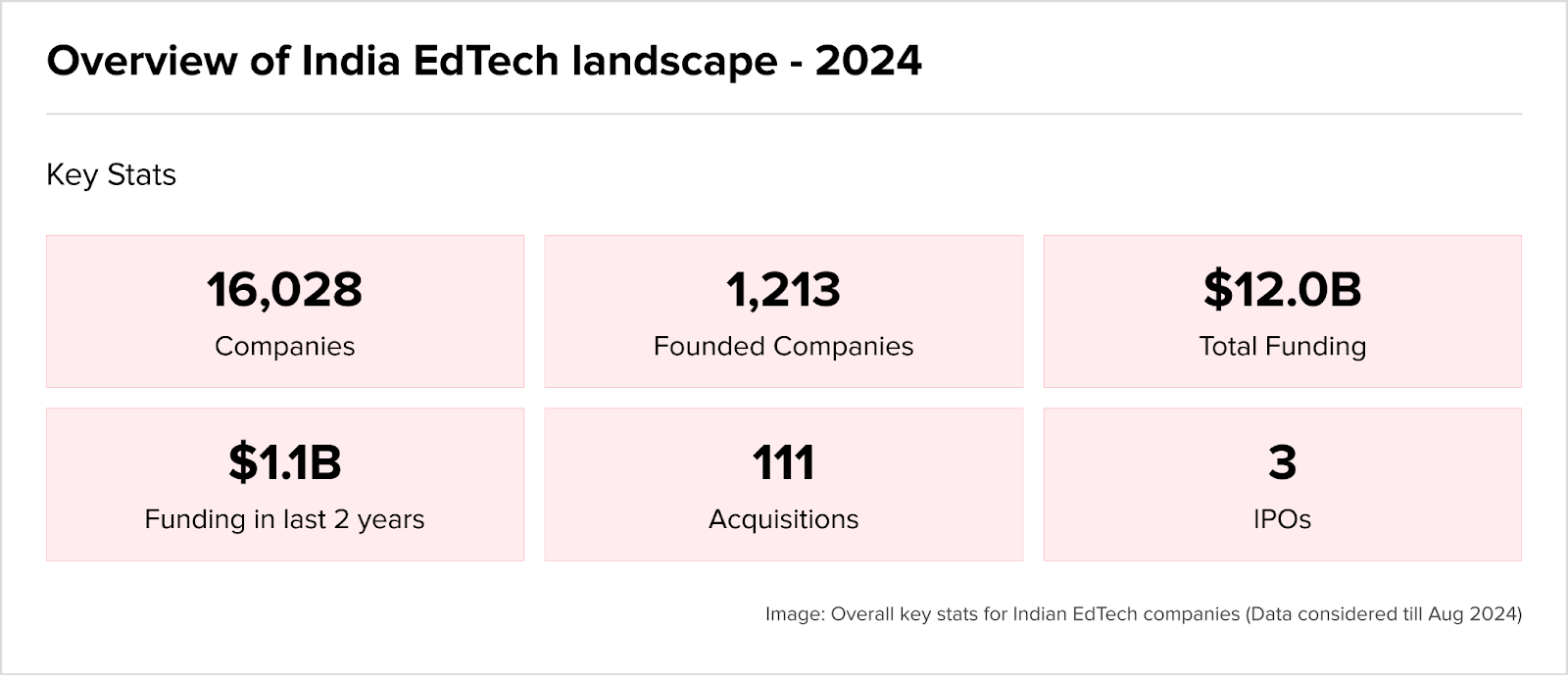 Still, India counts over 16,000 budding and growing edtech companies, of which more than a thousand are venture-funded, with cumulative funding at $12 billion.