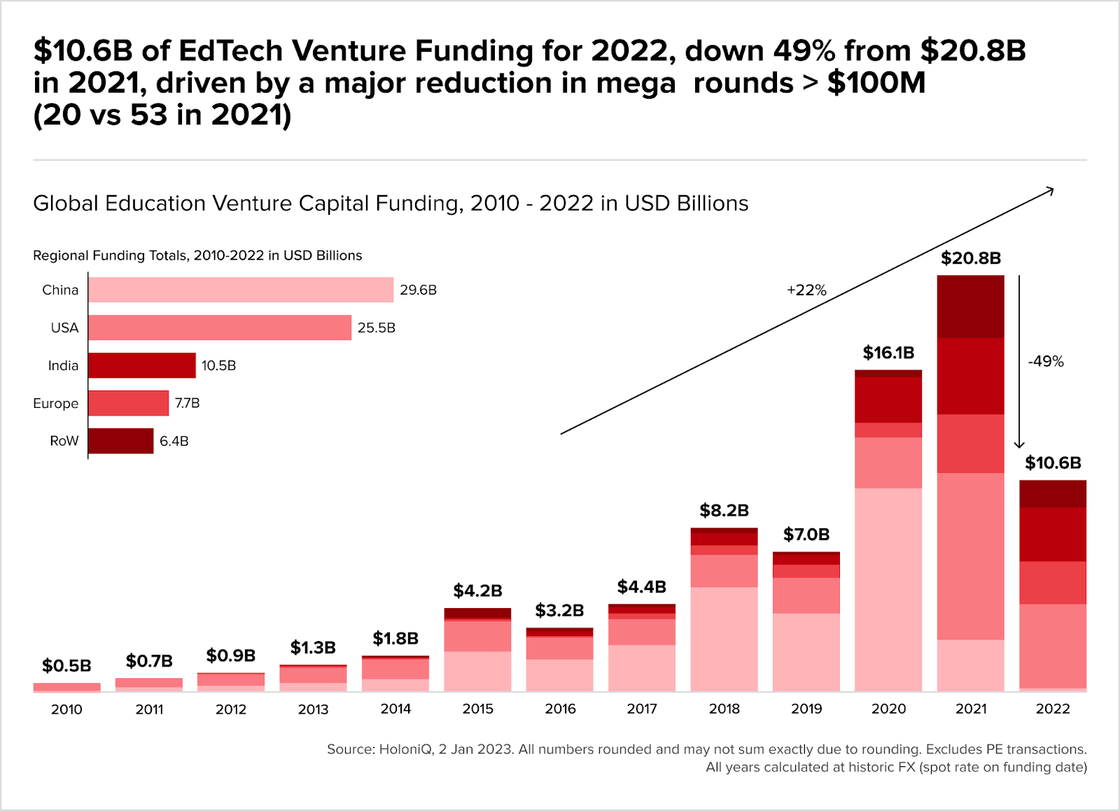 Yet HolonIQ, in 2022, said global edtech VC funding had halved (49%) year-on-year to $10.6 billion, down from $20.8 billion in 2021. This was caused by the collapse of the mega-rounds of $100 million+ from 53 in 2021 to just 20 in 2022.